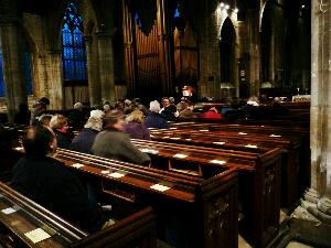 Just before 4:30pm we made our way down to the church and sat in the pews for the service, led by the Reverend Chris Harrington. It was a somewhat unusual service with a variety of bellringing hymns, including "Ding dong merrily on high" and "Lifted gently to the steeple". The main points of interest were a "Michael Parkinson" style interview with Les Townsend and Bob Hodges (a local ringer) on what got them started in bellringing and the singing of Pete Seeger's "If I had a hammer", accompanied by the vicar on the guitar. This seems to be a recurring theme (guitar playing vicars), because the vicar of Swinderby did the same at the Central Branch Carol Service. The organ was played enthusiastically by John Lyon who played Boellmann's Toccata after the service.