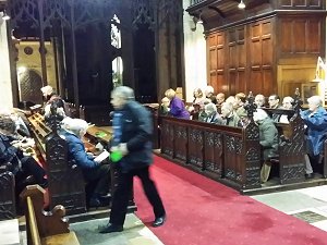 Just before 4:30pm we went down into the church. We all crammed into the Choir for the service, which was led by the Reverend Philip Johnson. We followed the form of service laid down in the Ringers Guild Office with hymns from the green booklet. The organ was played by David Prescott and local ringer Dawn Howells read the lesson, which was 2 Chronicles 5 verses 1 to 5 and 10 to 14. The Reverend Johnson preached a sermon on this reading.