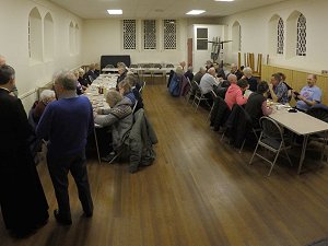After the service, we went next door to the Parish Rooms, for tea. This was Fish and Chips (or Sausage and Chips), pre ordered from the local chippy. There was plenty of bread and butter and cups of tea and coffee not to mention mushy peas. Those members not wishing Fish and Chips were catered for with cold meat salads. There was a choice of plum or apple crumble with either cream or custard for dessert.