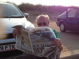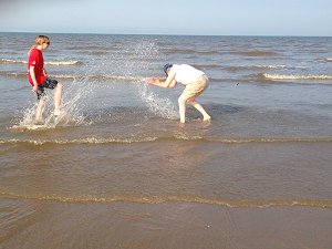We then made out way to the beach. Some of us went into Mablethorpe itself, while another group went to Huttoft Bank. A delicious fish and chip supper was served, and we went for a little paddle and a game of boules on Mablethorpe sands, meanwhile a knobbly knees competition and water fight were had at Huttoft beach, along with another game of boules which Gill won. This was then followed by a very exciting cricket match, umpired by John from behind the newspaper, and won by Sylvia by a spectacular 8 runs!