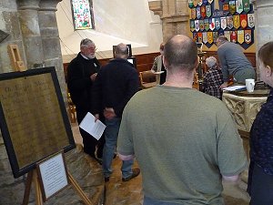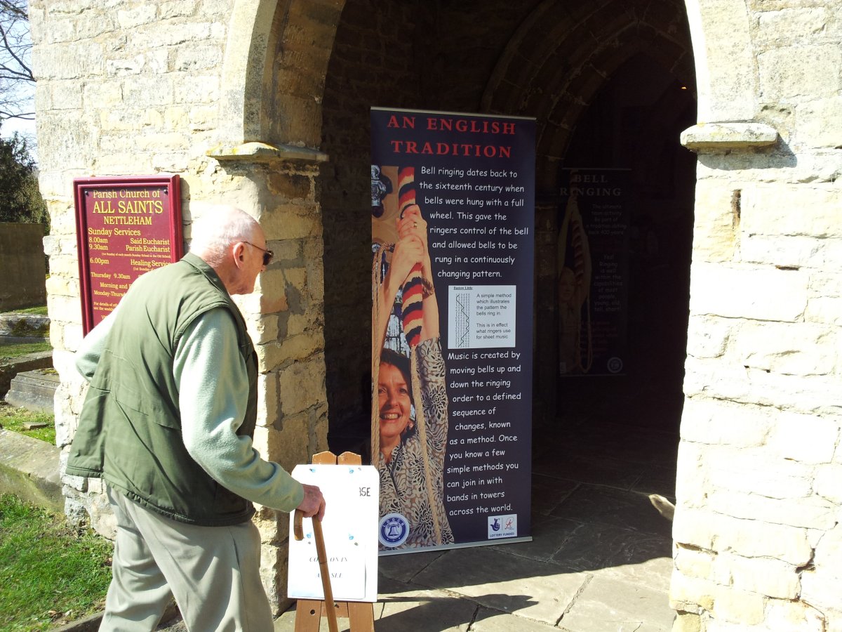 It was decided to use the peal attempt as fundraising event in the church. This is in aid of the Nettleham Tower Fund. To support this, a great deal of activity was organised in the church. Dot and Phil Mason brought their portable mini ring and set it up by the pulpit in the church, so that visitors could have a go. Ian Douglas had brought the peal board down from the tower and set it up in the church on an easel, so people could view it, along side a clear statement of what was written on the peal board for the benefit of people who might struggle with the faded lettering and the "Olde English". The text is reproduced below.