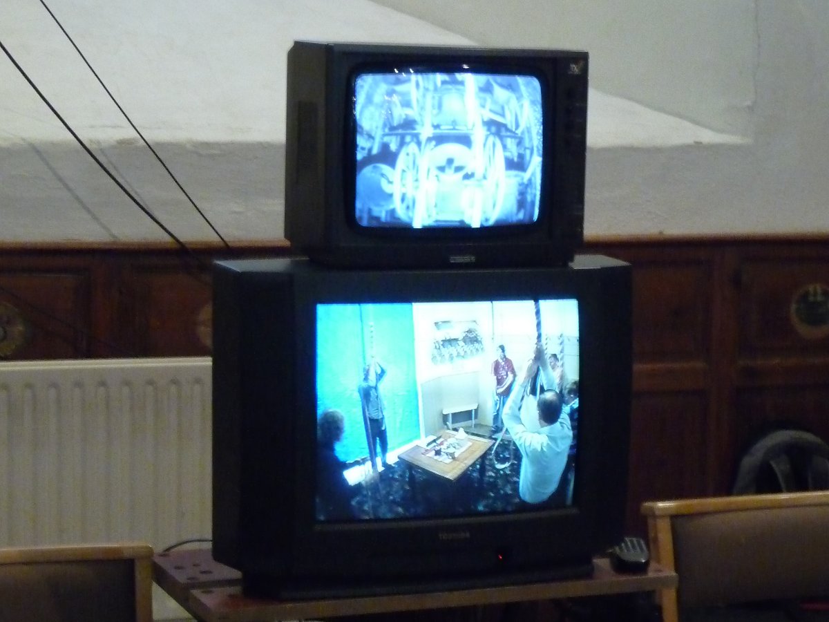 People started to arrive about 1:30pm and the peal band turned up and prepared to start the peal. After some minor adjustments of the ropes, the peal was started shortly after 2:00pm, eagerly watched on the remote monitors downstairs by a large group of people.