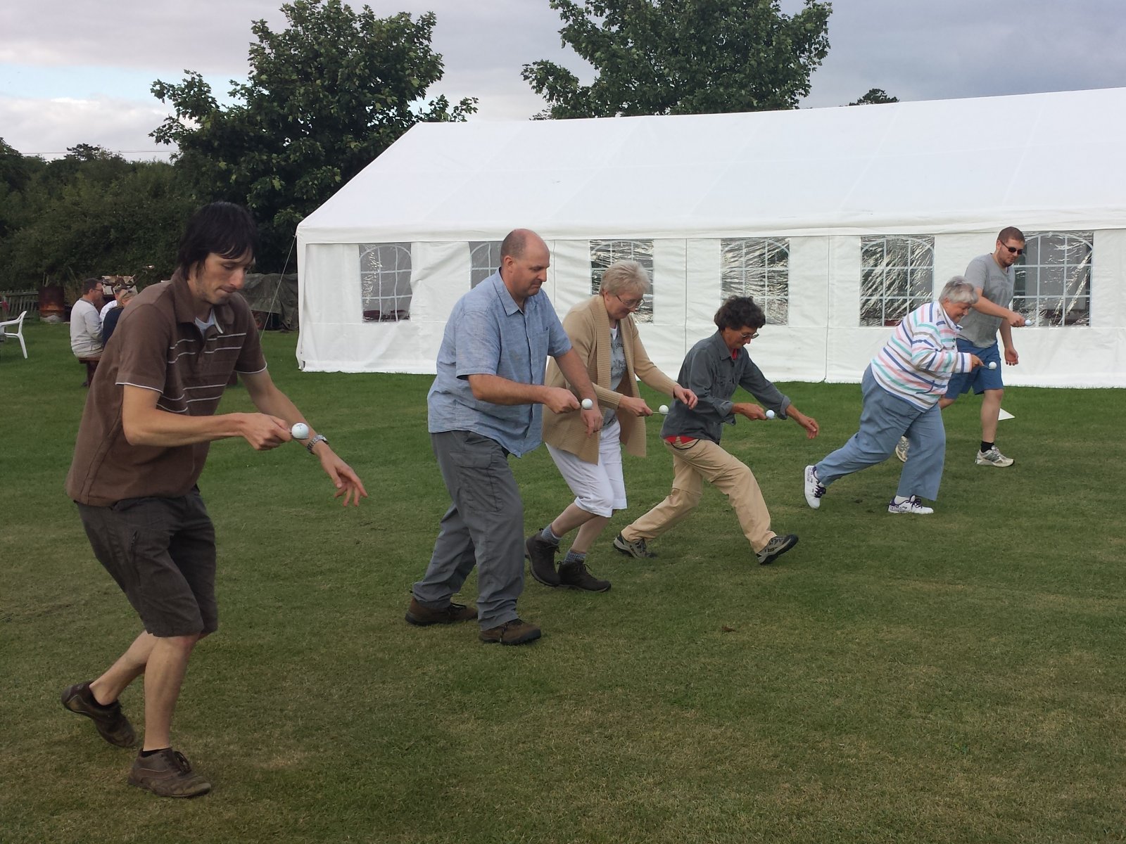 Some bright spark (Claire!) suggested we should have an Egg and Spoon race. A brief search of the Pavillion revealed a collection of spoons, but no eggs. However Yvonne Woodcock disappeared and returned with half a dozen substitute eggs, which looked suspiciously like golf balls. So we were ready for a "Golf Ball & Spoon" race. Claire having suggested it was unfortunately unable to compete due to having a broken toe. However 6 volunteers were found for the race which was won by the Guild Secretary, Sandra Underwood.