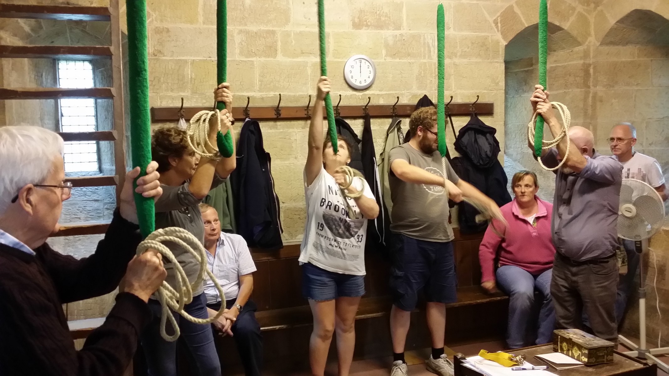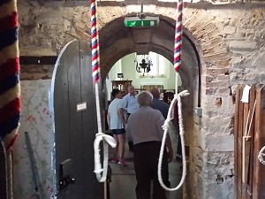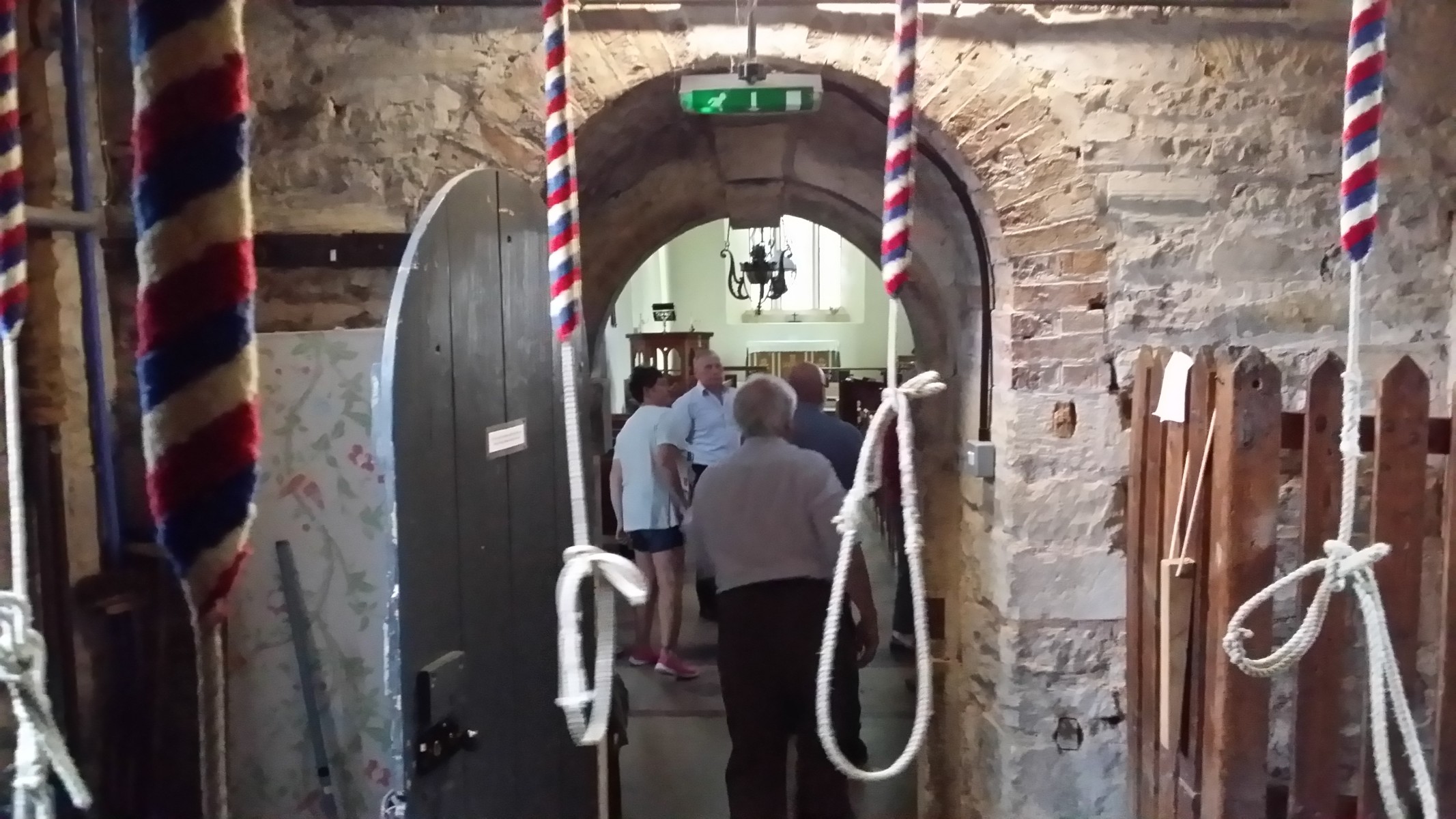 Eventually they hoved into view and parked up. Apparently the trusty SatNav had sent them down some farm track with a number of gates to be opened and closed. We followed the local TC round the back of the church and up some steps into the tower. There was a low section to negotiate which turned out was under the organ. The steep staircase brought us up round the organ and over the top of the swell box before depositing us in the ringing room. It would be interesting to see how loud the organ is when trying to reach the bells.