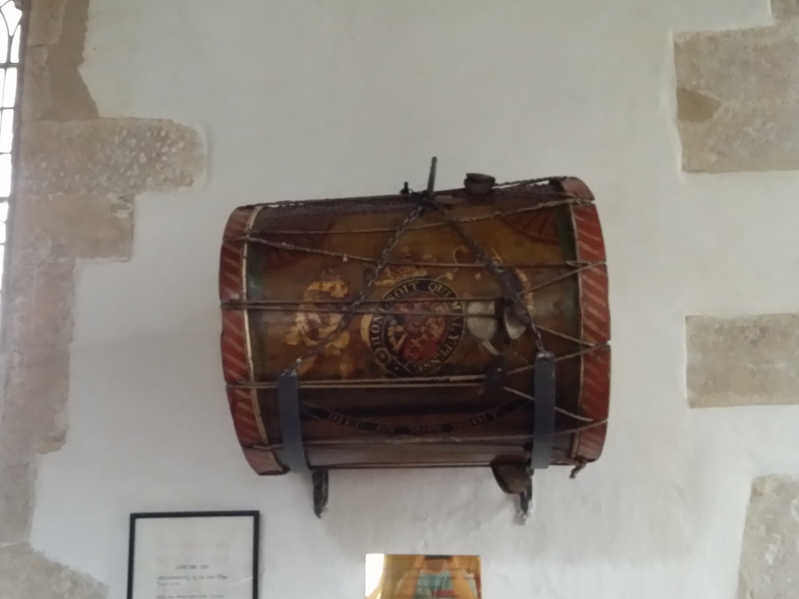 Eventually I located the church and parked up. Inside the church there were several ringers, but not as many as I would have expected. I had a walk round the church while others were ringing and came across an unusual artefact on the north wall. This was drum that had been used at the Battle of Waterloo on 18th June 1815 and had subsequently been used by the local village band at the Orston Friendly Society Club feast which was always held on the second Friday in June.