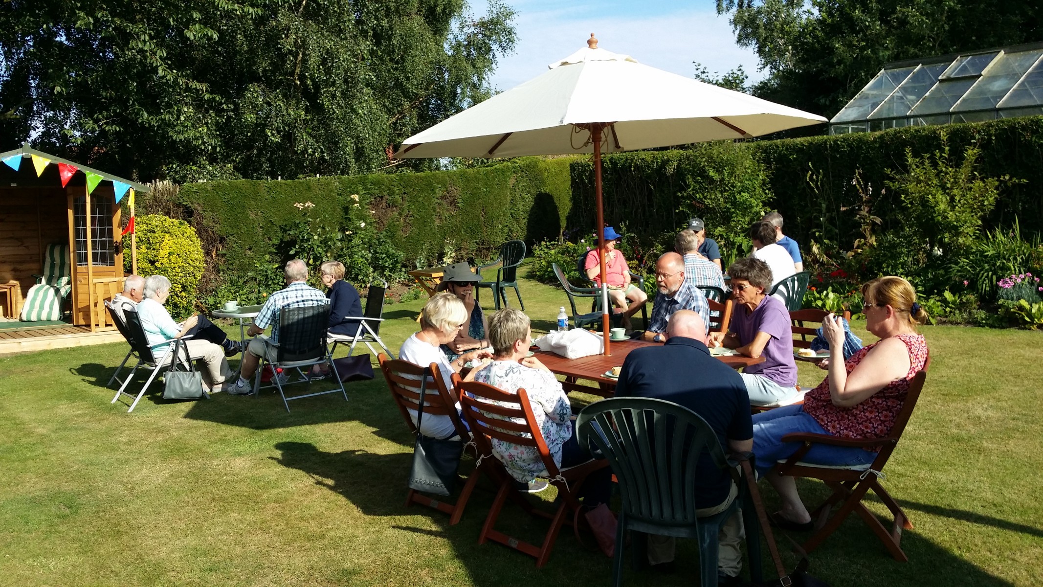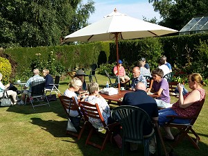We then made our way down to "The Conifers", also known as the Woodcock residence. Tables and chairs had been set out on the lawn and a buffet of epic proportions had been prepared. There was a small gazebo with an urn boiling away for tea and coffee, which as you can imagine the ringers consumed a lot of.
