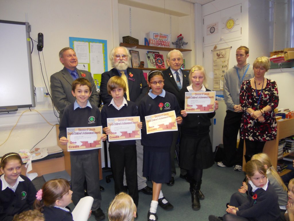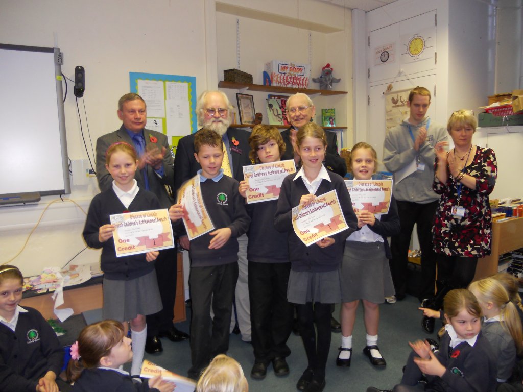 On Friday 4th November, Ron Applewhite as the oldest member of the Potterhanworth band, presented Church Children�s Achievement Awards Credit Certificates for climbing the tower at Potterhanworth CE Primary School�s Celebration Assembly. Dave Rose the Diocese Children and Youth Officer was also present.
