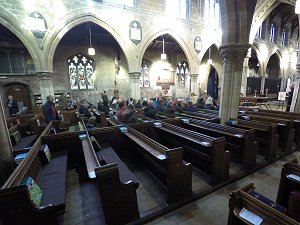At 12:00 the ringing stopped and we went down into the church for the service, led by the Revd. Charles Patrick. The service used the green Guild Office booklet, but with some of the hymns taken from the local hymnbook instead. The reading was taken from Luke's Gospel, chapter 2, The Presentation of Christ in the Temple, read by Edward Vear. The Rector preached a sermon based on the reading interspersed with some references to bellringing.