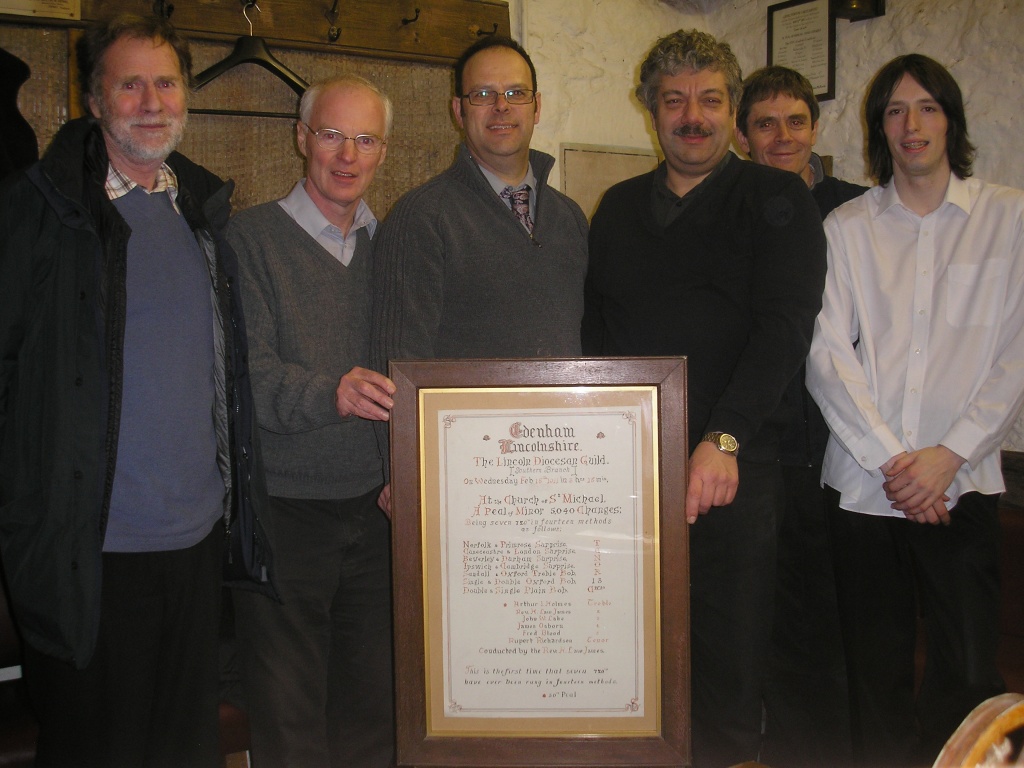 with the 1911 peal board at Edenham, L-R: Graham Colborne 1, Jim Benner 2, Mark Mumby 3, Ian Dawson 4, Barry Jones 5, Chris Woodcock 6. |