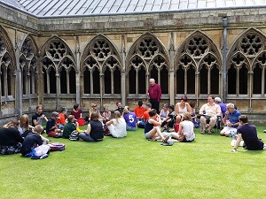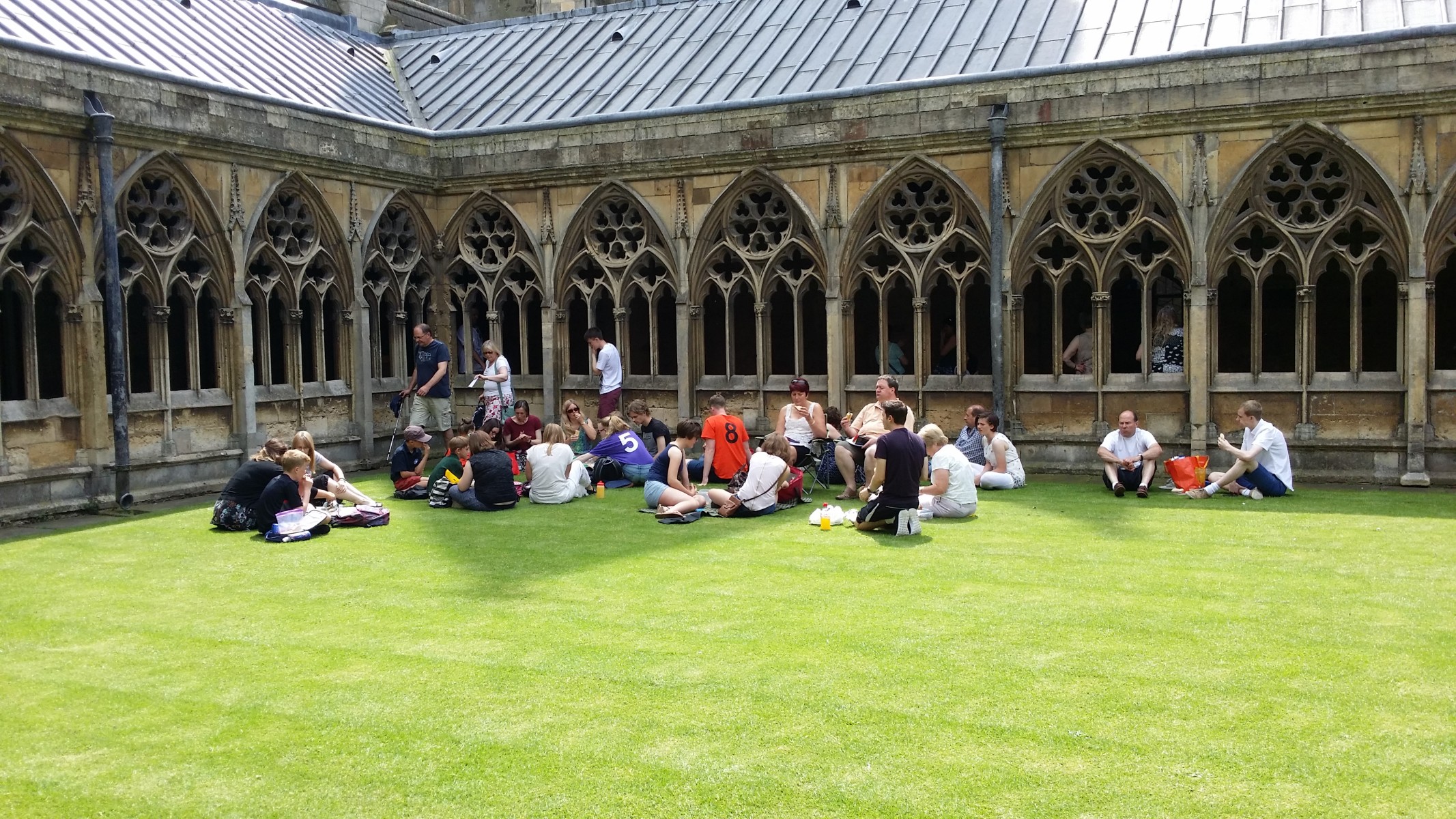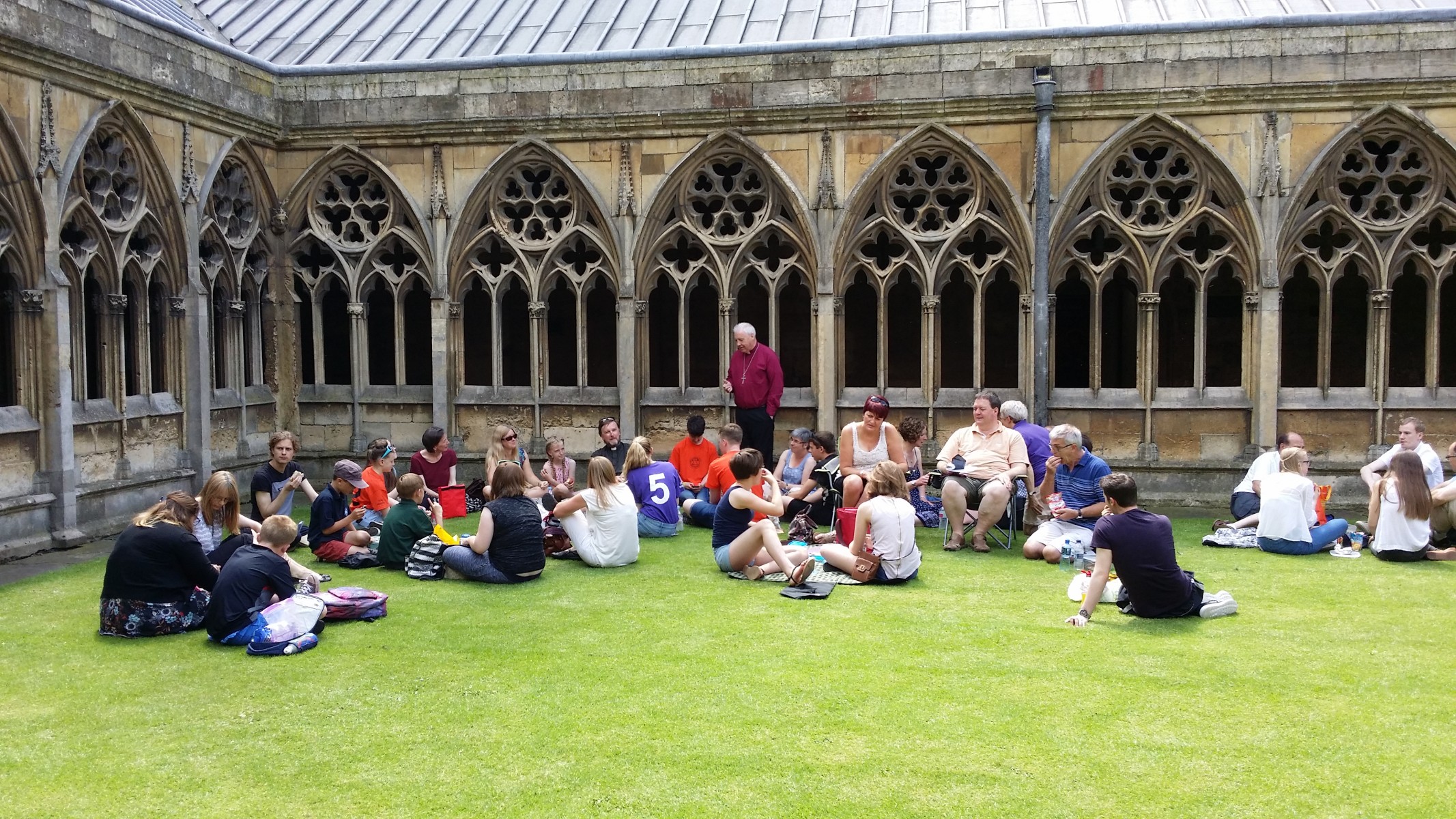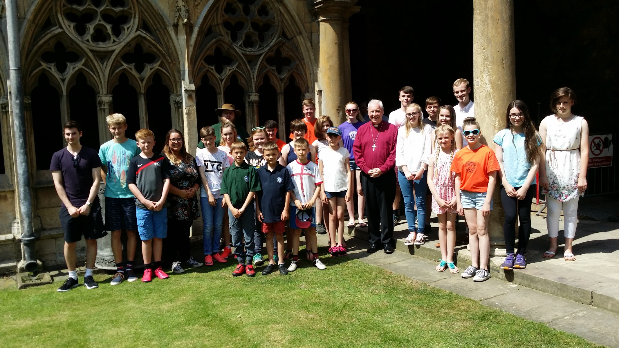 The bulk of them decided to sit in the shade of the southeast corner of the Cloisters to eat their picnic lunch. Presently, the Right Reverend Christopher Lowson, Bishop of Lincoln turned up with his assistant the Reverend Sally McDougall. The Bishop mingled with the young ringers and their assorted adult companions and before we left the Cloisters we had a photograph of the Bishop with the young ringers.