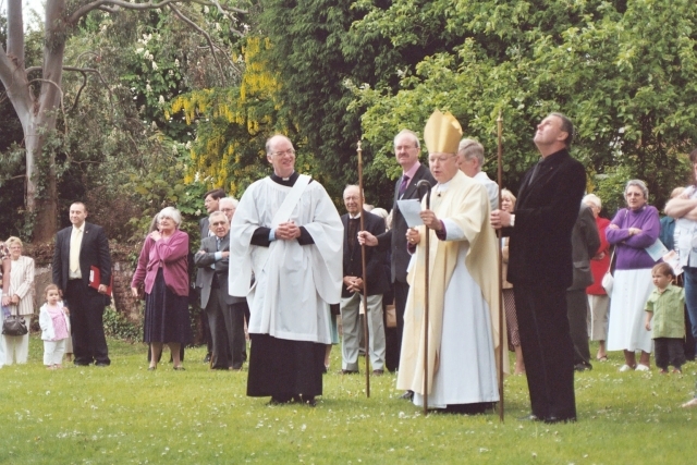 Ringing on the new twelve took place before the service, and Bishop David accompanied by the Vicar of Barrow visited the Ringing Chamber to watch ringing in progress. They then climbed up into the bell chamber, where the Bishop sprinkled Holy Water and anointed the new fourth bell with sacred oil, as he prayed over the new bells. It was no mean feat to climb up the ladder wearing a cassock, and all present were impressed that Bishop David was prepared to do this!