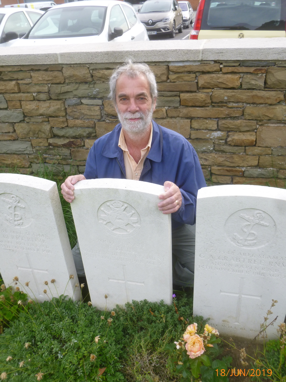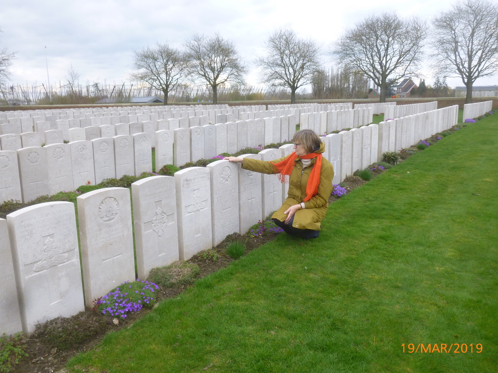 My home tower is Stow, in Lincolnshire. 24 men from Stow parish died during WW1, but none of them were ringers, so we did not have a specific 100th anniversary to ring a peal for. I then found out that one of these 24 men, Private Walter Mackfall, was the uncle of one of our ringers, so we rang a half muffled peal of Grandsire Triples on 23rd October 2017, the 100th anniversary of Private Mackfall's death, in memory of Private Mackfall and the other 23 men of Stow parish. Private Mackfall is buried at Lijssenthoek Military Cemetery, by Poperinge, in Belgium and this photograph shows my wife, Carolyn, paying her respects at his grave.