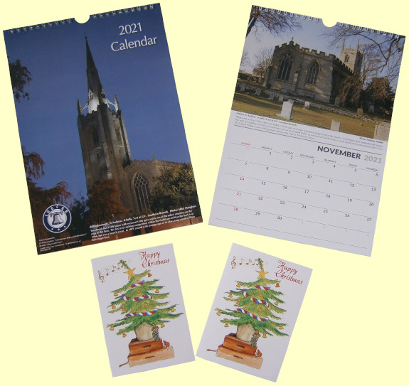 This year's cards and calendars are now available. The cards, costing £2 for a pack of 5 or £4 for a pack of 10 were designed by a Leicestershire ringer, Rebecca Banner, with Philip Green's impish addition. As ever, they are beautifully produced on high quality card.