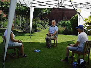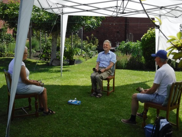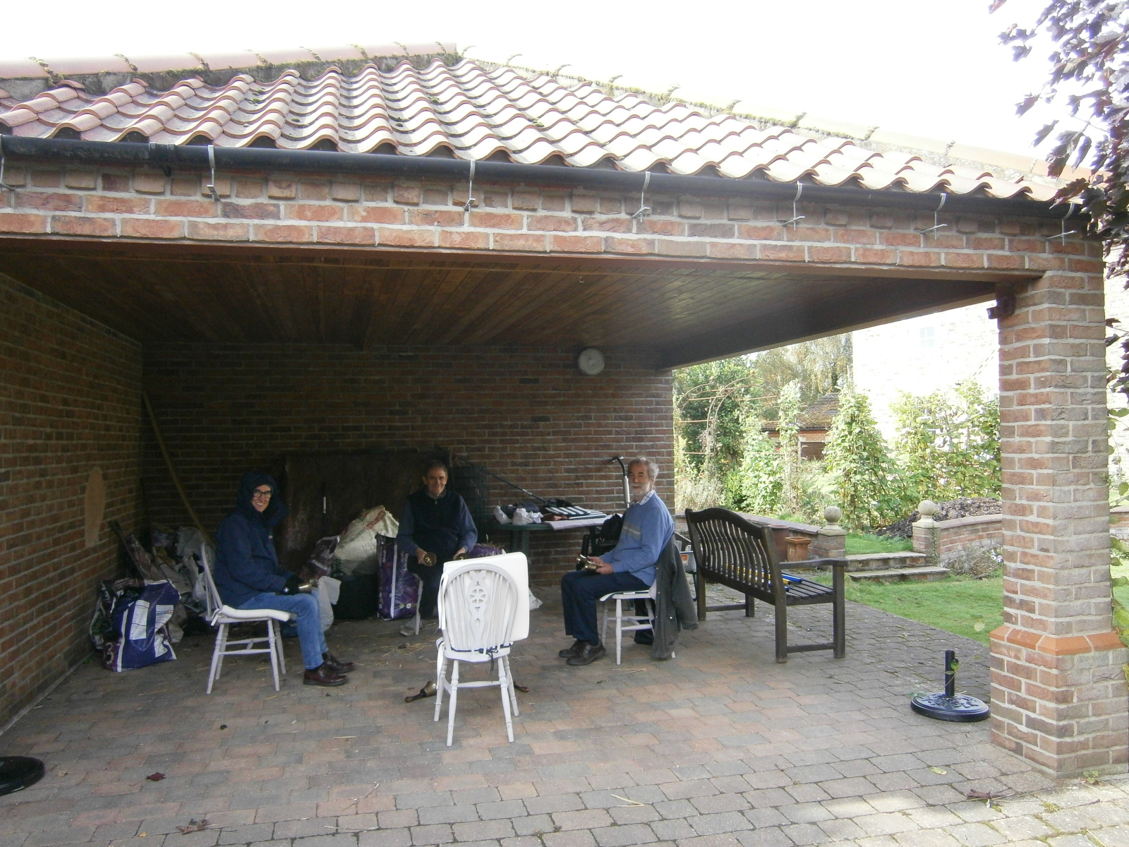 Our first venue was Sue's gazebo in the garden at Willingham. This was absolutely fine in good weather, but not up to the job in windy conditions (it lifted off on one windy day in June, landing on its side and bending a leg in the process.) So very careful attention has had to be paid to weather forecasts ever since.