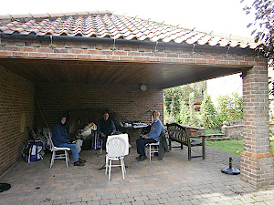 Our next venue was Chris Turner's carport. A brick built structure with two open sides gives plenty of protection from the elements and makes a lovely venue. It has been pealed several times. The only peal of major so far was rung there - but we had to contend with the minute but incredibly annoying thrips crawling around any bits of exposed skin. The local farmers had been harvesting. Truly an awful form of torture.