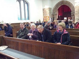 At about 4:10pm members began assembling in the church for the service. This was led by the Reverends Stephanie and Rhys Prosser. Stephanie conducted the service and Rhys read the lesson and delivered an amusing sermon likening the church to a football club (Rhys is keen Cardiff supporter). Not everyone can get to the stadium to support their team in the same way that not everyone can get to the church, but the bells remind the people in the vicinity that God is present.