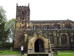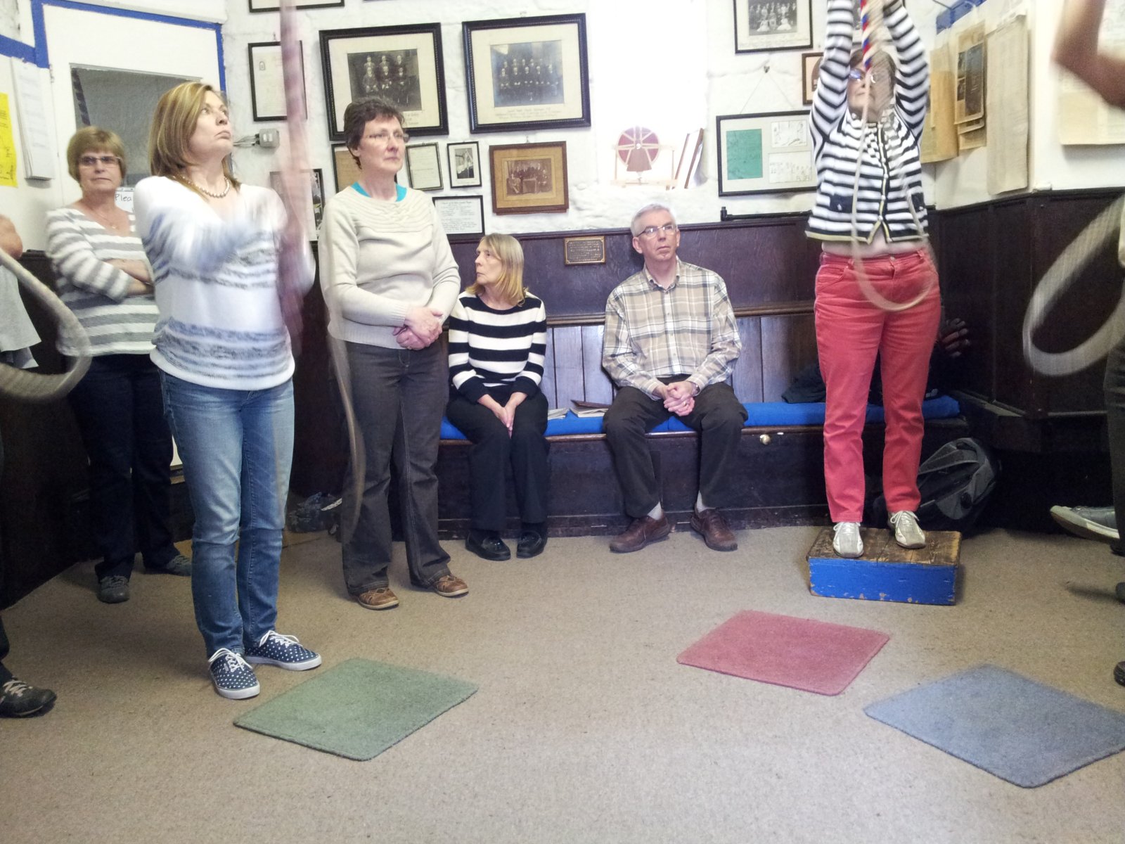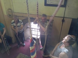 The next tower was also in Sandal Magna, this being St. Helen's. Since it was about 200 yards from The Castle, many of us decided to leave our vehicles in The Castle car park and walk to the church. There was quite a narrow set of stairs here and a low passage to traverse, which required anyone much over 5 foot to stoop to get into the tower. This gave the impression that when we reached it, the ringing room would be quite cramped, but in fact it was quite the opposite, being extremely roomy with plenty of natural daylight from the three windows and bright whitewashed walls. This is obviously a well loved tower judging by the walls, which were covered with old photographs, newspaper clippings, cartoons and a "Rogues" Gallery of local ringers.