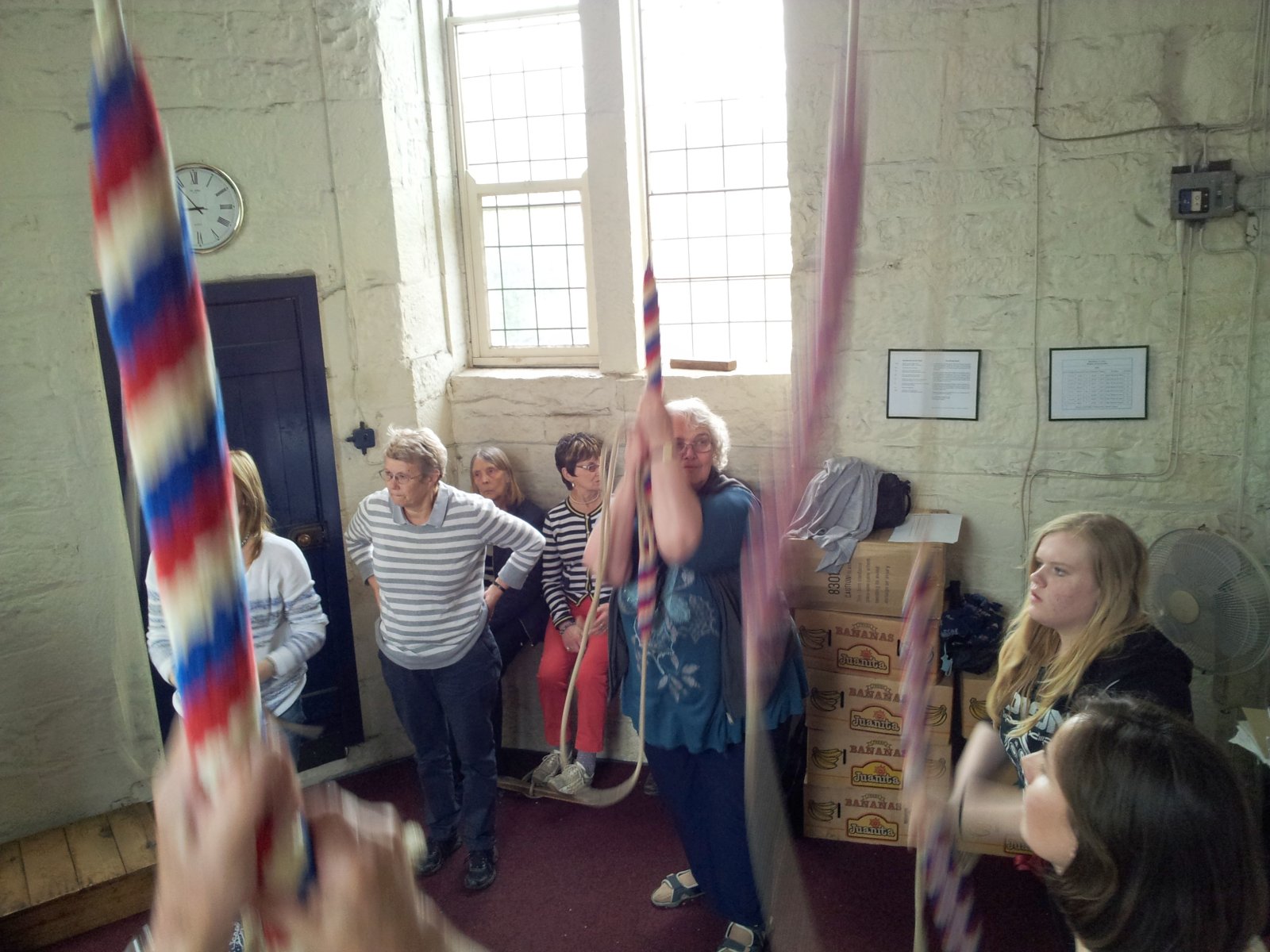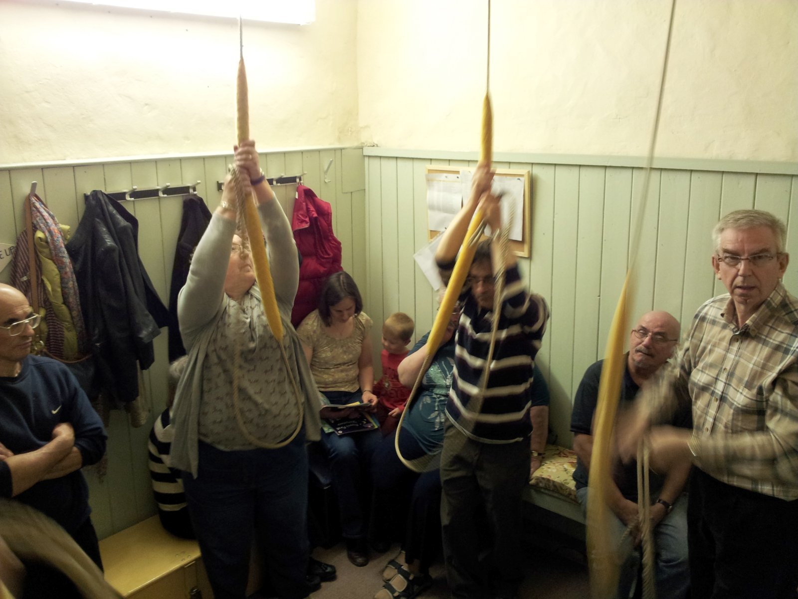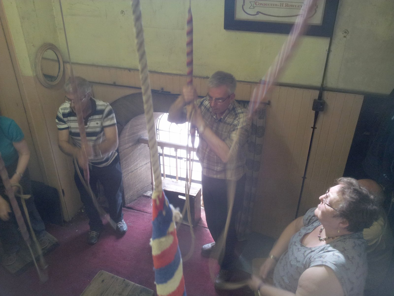Next stop was St. Peter and St. Leonard at Horbury. This required a certain degree of navigational ability to reach this from Sandal Magna. Probably OK in a car with a SatNav. Not so easy on a motorbike. Despite this, I tracked the tower down and found that the access to this tower was much easier. The ringing room was however something of a contrast to Sandal Magna, being much more cramped, especially as this was the first 8 bell tower of the day. The single window was at floor level and the decor somewhat darker. However we did some reasonable ringing and in between ringing people could look round the church below.
